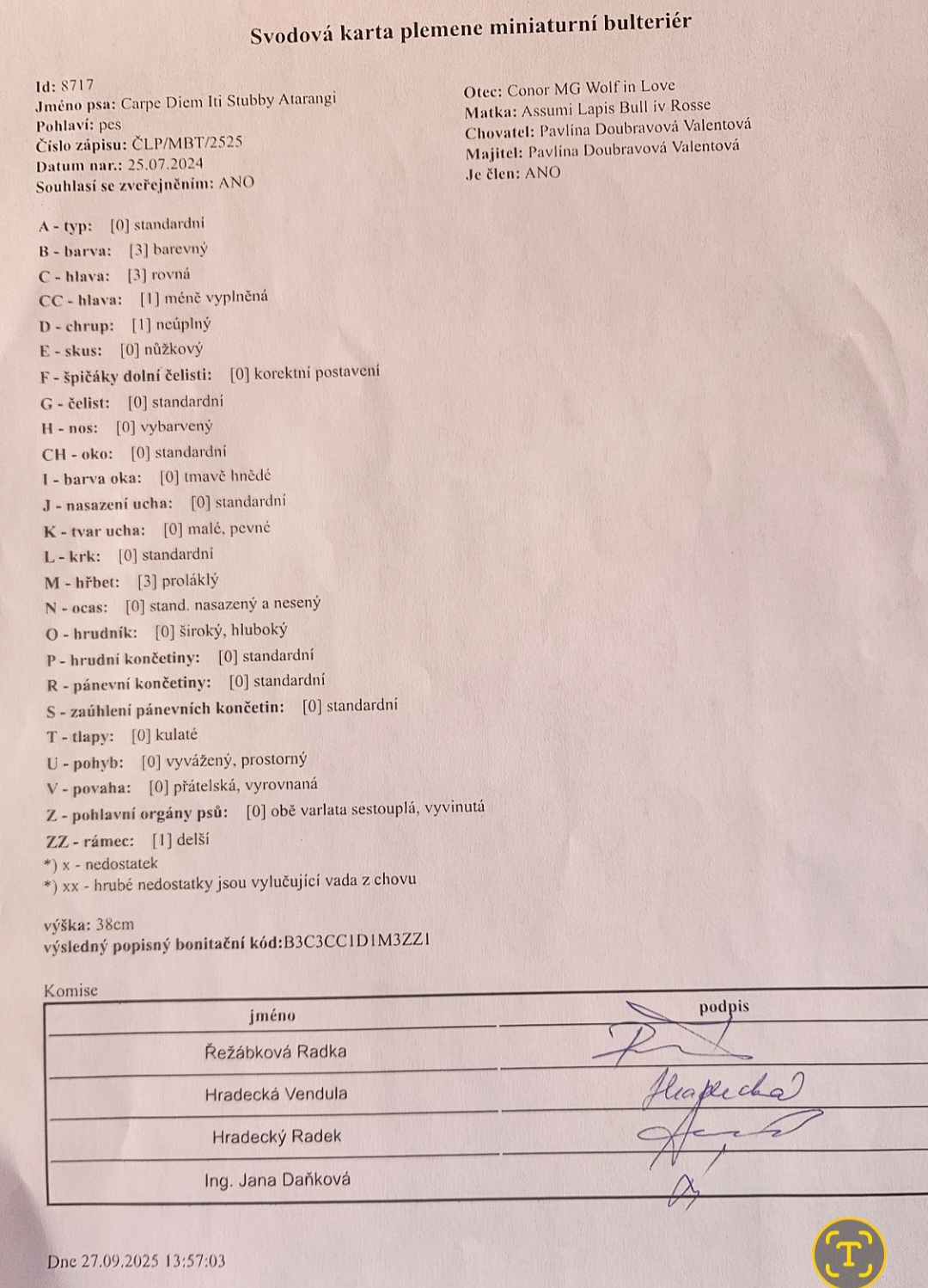 - desetiměsíční pejsek, vynikající hlava s krásným profilem a plností, malé tmavé a trojúhelníkové oči, správné uši, atraktivní horní linie, správně nasazený ocas, výborné úhlení, silné kosti, dobrý pohyb končetin